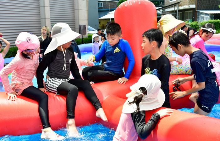 도서관 주차장에는 오전부터 이동식 워터파크가 설치돼 아이들을 맞이했다.