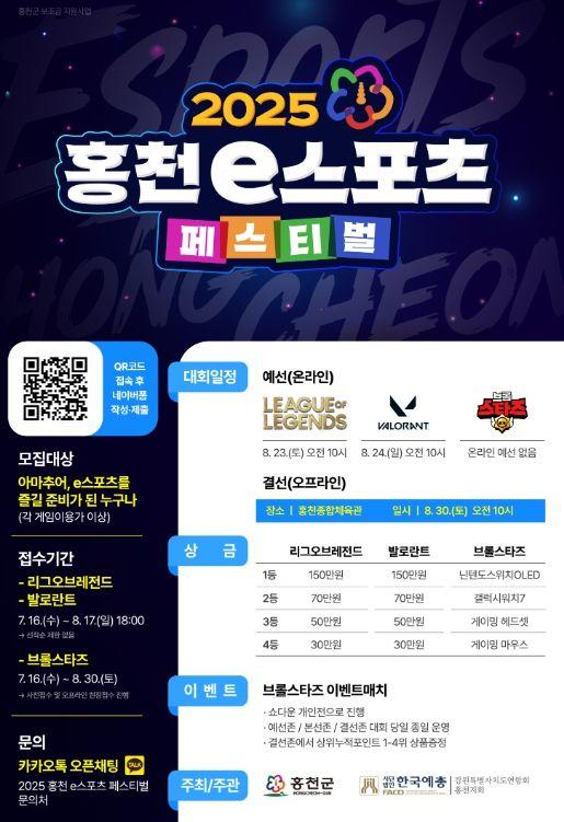 ㈜한국탑뉴스 송행임 기자 | 홍천군이 주최하고 (사)한국예총 홍천지회가 주관하는 2025 홍천 e스포츠 페스티벌이 8월 30일 홍천종합체육관에서 열린다.