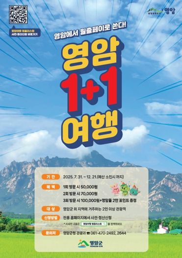 ㈜한국탑뉴스 한기석 기자 | 영암군이 이달 말일부터 올해 말까지 2인 이상 관광객에게 최대 24만원의 지역화폐 등을 주는 ‘영암여행 원플러스원(1+1)’ 사업을 진행한다.