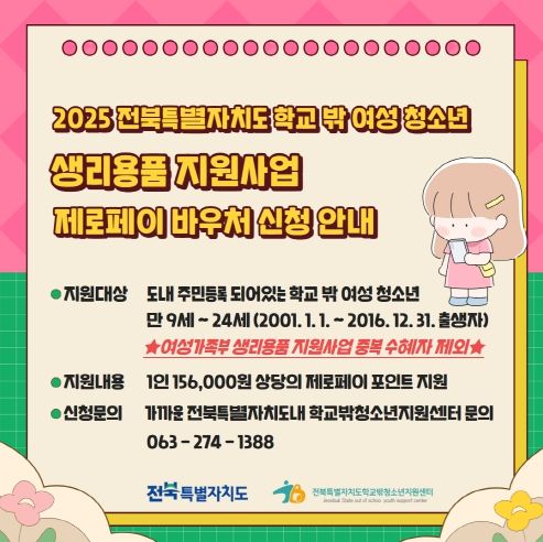 자세한 문의는 전북특별자치도 학교밖청소년지원센터 생리용품 담당자(063-274-1388) 또는 도내 각 시·군 학교밖청소년지원센터를 통해 가능하다.