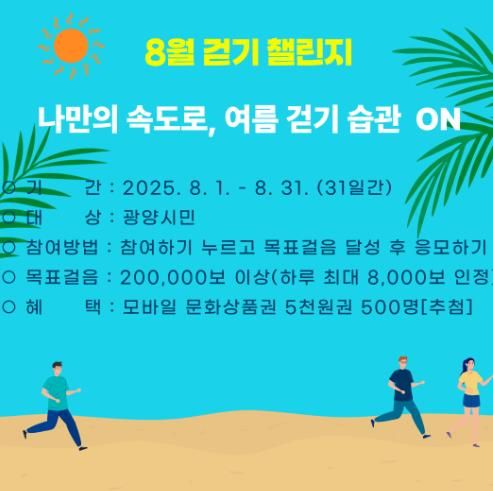㈜한국탑뉴스 한기석 기자 | 광양시는 오는 8월 1일부터 31일까지 한 달간 모바일 걷기 앱 ‘워크온(WalkOn)’에서 ‘나만의 속도로, 여름 걷기 습관 ON’ 8월 걷기 챌린지를 운영한다고 밝혔다.
