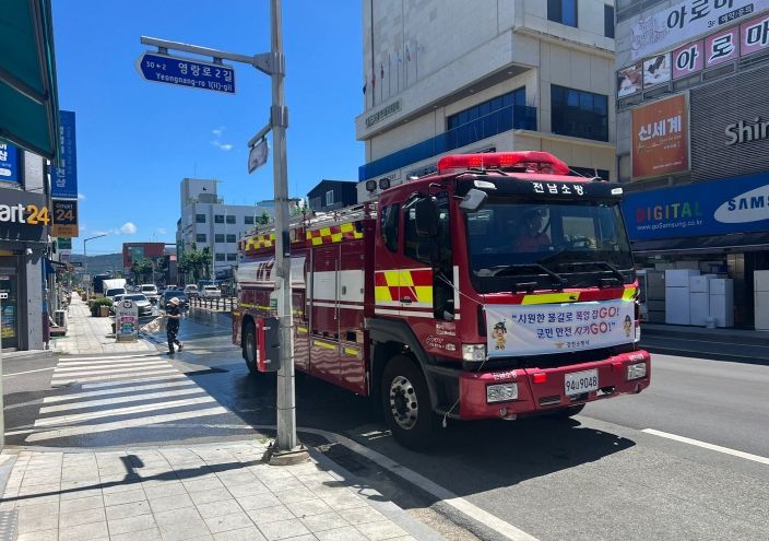 ㈜한국탑뉴스 한기석 기자 | 강진소방서는 연일 이어지는 폭염에 대응하여 도로와 주거지에 대한 소방차 살수 지원 활동을 지속적으로 전개하며 주민 안전 확보와 불쾌지수 저감에 총력을 기울이고 있다.