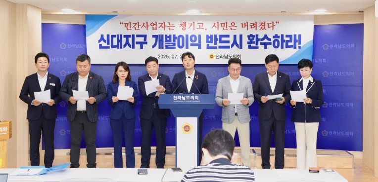 ㈜한국탑뉴스 한기석 기자 | 전라남도의회 순천지역 의원들은 7월 28일 공동성명을 통해 “순천 신대지구 개발을 통해 민간사업자는 천문학적인 이익을 챙겼지만 정작 순천시민에게 돌아온 것은 아무것도 없다”며, “광양경제자유구역청과 순천시는 즉각 개발이익 환수에 나서야 한다”고 촉구했다.