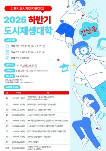 ㈜한국탑뉴스 송행임 기자 | 강릉시가 도시재생사업의 주체로서 지역 주민의 역량을 강화하고 공동체 중심의 도시재생을 실현하기 위해 7월 29일부터 8월 28일까지 '2025년 하반기 도시재생대학'을 운영한다.