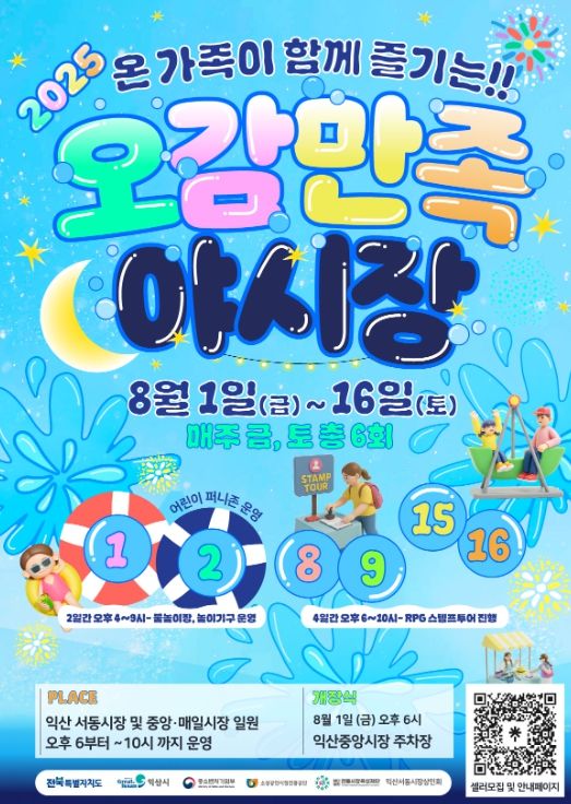 익산시는 오는 8월 1일부터 16일까지 매주 금·토요일, 중매서 전통시장 일대에서 '2025 오감만족 야시장'을 개최한다.