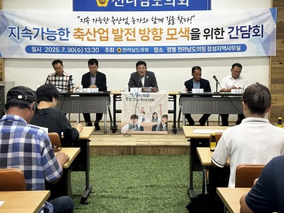 ㈜한국탑뉴스 한기석 기자 | 전라남도의회 정철 의원(더불어민주당·장성1)이 지난 7월 30일 장성군에서 축산업 관계자들과 함께 ‘지속가능한 축산업 발전 방향 모색을 위한 간담회’를 열고 현장의 목소리를 듣는 시간을 가졌다.