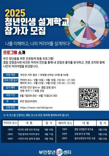 이번 인생설계학교는 전문 진단검사와 맞춤형 코칭을 통해 개인의 흥미, 성향, 강점을 분석하고, 이를 바탕으로 진로 방향을 구체화하는 청년 맞춤형 역량 강화 프로그램으로 9월 부안청년UP센터에서 진행할 예정이다.