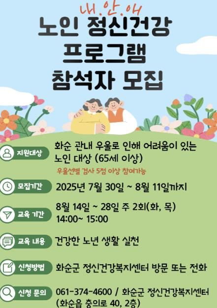 ㈜한국탑뉴스 한기석 기자 | 화순군은 보은병원에 위탁 운영 중인 화순군정신건강복지센터에서 오는 14일 노인 정신건강 프로그램 ‘내안愛’를 개최한다고 밝혔다.