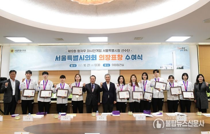 불탑뉴스 기자 | 김현기 서울특별시의회 의장은 27일 제19회 항저우 아시안게임에서 뛰어난 성적을 거둔 서울시 직장운동경기부 선수 12명에게 의장 표창을 수여했다.