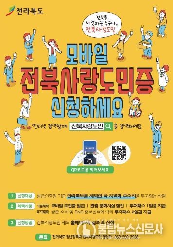 불탑뉴스 기자 | 전북도는 타 지역민들의 전북에 대한 관심 제고와 향후 미래인구 증가를 위해 전북 외 거주자 대상 ‘모바일 전북사랑도민증 발급’을 본격 시행 중이라고 30일 밝혔다.