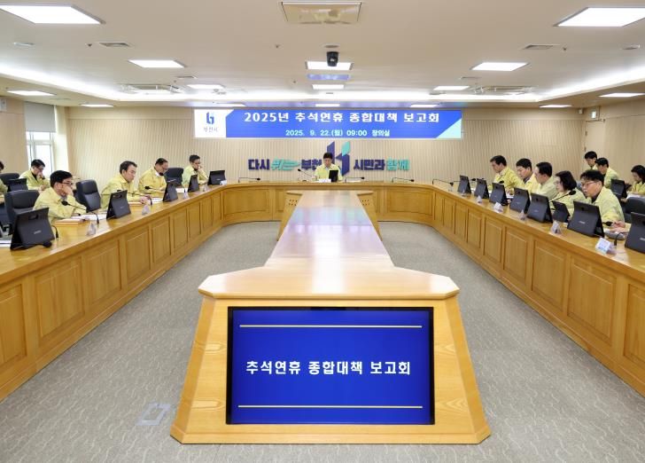 ㈜한국탑뉴스 차복원 기자 | 부천시는 지난 22일 시청 창의실에서 조용익 시장을 주재로 부시장을 비롯한 국장과 부서장이 참석한 가운데 ‘2025년 추석 연휴 종합대책 보고회’를 열었다. 이번 보고회는 7일간 이어지는 추석 연휴를 앞두고 시민 생활 전반에 걸친 분야별 대책을 점검하기 위해 마련됐다.