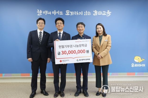불탑뉴스 기자 | 대한적십자사 울산혈액원(원장 최인규)이 30일 헌혈기부권 나눔장학금 3,000만 원을 울산광역시교육청(교육감 천창수)에 전달했다.
