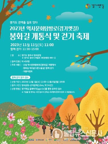‘경기옛길 봉화길 개통식 및 걷기 축제’의 참가 접수는 11월 1일부터 6일까지 진행되며, 경기옛길 누리집(ggcr.kr)을 통해 접수할 수 있다.