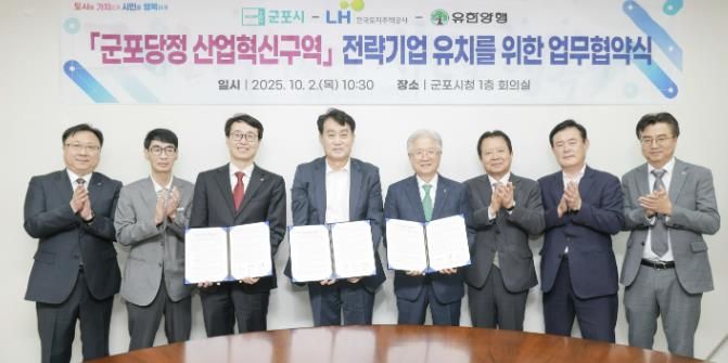 ㈜한국탑뉴스 차복원 기자 | 군포시는 2일 군포시청에서 한국토지주택공사(LH), ㈜유한양행과 ‘군포당정 산업혁신구역’ R·D 전략기업 유치를 위한 업무협약을 체결했다고 밝혔다.