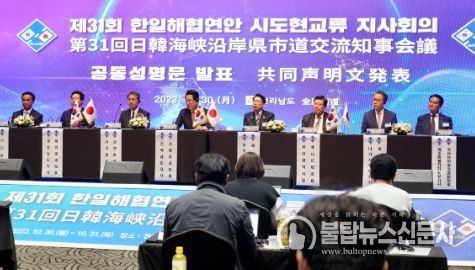 제31회 한일해협연안 시도현 교류 지사회의가 30, 31일 이틀간 일정으로 전남 여수시 일원에서 열리는 가운데 한국의 제주·부산·전남·경남과 일본의 후쿠오카·사가·나가사키·야마구치현 등 8개 시도현 지사들은 한일 양국 간 우호 협력 증진을 주요 내용으로 공동성명문을 발표했다.