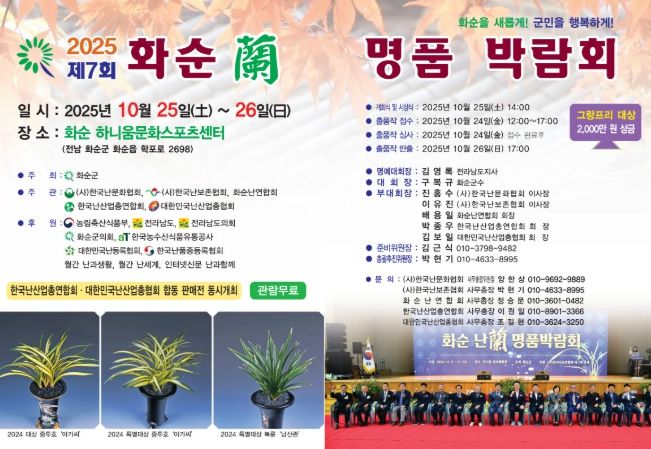 ㈜한국탑뉴스 차복원 기자 | 대한민국 난(蘭) 산업의 중심지로 자리매김하고 있는 전남 화순군이 ‘제7회 2025 화순 난 명품 박람회’를 오는 10월 25일부터 26일까지 이틀간 화순 하니움문화스포츠센터 실내체육관에서 개최한다.