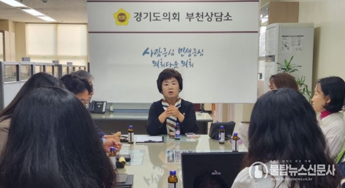 불탑뉴스 기자 | 경기도의회 교육기획위원회 황진희 위원장(더민주, 부천4)은 10월 31일 부천상담소에서 경기도교육청 학교설립기획과, 한국국·공립유치원 연합회 회장, 경기도공립유치원교사연합회 관계자, 학부모 대표자들이 함께한 자리에서 ‘유치원 유아 정원 감축 요구’에 관해 논의하는 자리를 가졌다.