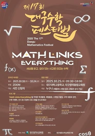 ㈜한국탑뉴스 고화랑 기자 | 대구시교육청이 주최하고 대구중등수학교육연구회가 운영하는 ‘제17회 대구수학페스티벌’이 10월 25일 9시 30분부터 대구과학고 및 대구창의융합교육원에서 'Math Links Everything(수학은 모든 것을 연결한다)'이라는 주제로 개최된다.