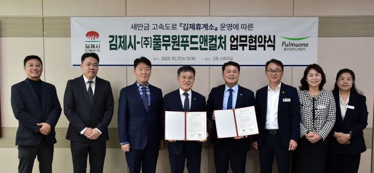 ㈜한국탑뉴스 차복원 기자 | 김제시는 27일 ㈜풀무원푸드앤컬처와 '새만금전주간' 고속도로 개통에 따라 새롭게 조성되는‘김제휴게소’운영에 따른 업무협약을 체결했다고 밝혔다.