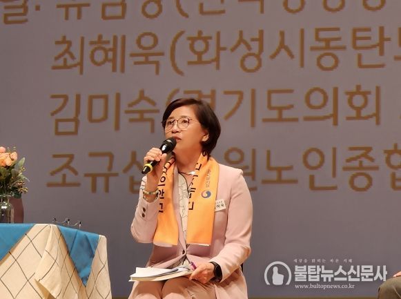 불탑뉴스 기자 | 김미숙 경기도의원(보건복지위원회, 더불어민주당, 군포3)이 31일 수원SK아트리움 대강당에서 열린 제4회 경기도 선배시민대회에 토크콘서트 패널로 참석해 지난 8월 전국 최초로 발의한 ‘경기도 선배시민 지원 조례안’에 대해 참석한 약 1,000명 이상의 선배시민들과 대화를 나눴다.