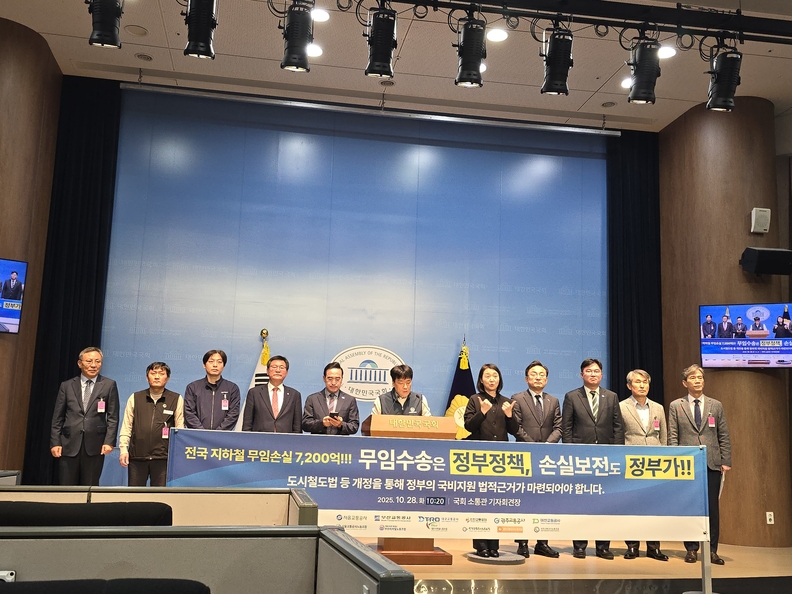 위기의 도시철도, 국가 복지 정책의 딜레마서울교통공사 등 전국 도시철도 운영기관 노사 대표가 박홍근·정준호 (더불어민주당), 이헌승 (국민의힘), 신장식 (조국혁신당) 의원 4인과 함께, 도시철도 무임수송 손실에 대한 정부의 국비 보전 결단을 강력히 촉구하는 기자회견을 10월28일 국회소통관 기자실에서 개최했다