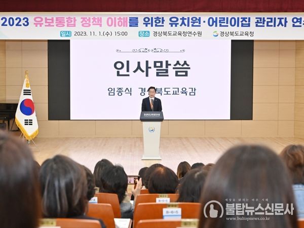불탑뉴스 기자 | 경북교육청은 지난 1일 경상북도교육청연수원에서 도내 유치원·어린이집 원장, 원감 500여 명을 대상으로‘유보통합 정책 이해를 위한 유치원·어린이집 관리자 연수’를 실시했다고 밝혔다.