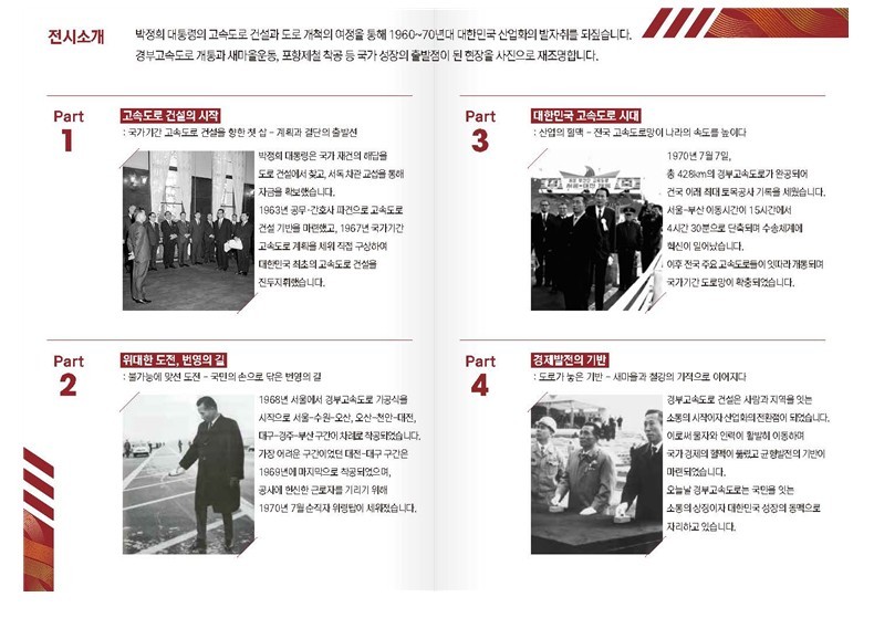 또한, 경부고속도로를 축으로 대전·대구·부산이 광역도시로 성장해 나간 과정과 함께, 박정희 대통령의 고향인 구미를 비롯해 수원·안성·천안 등 내륙 산업 도시들이 성장과 도약을 이룬 역사적 의미도 이번 전시를 통해 한눈에 확인할 수 있다.