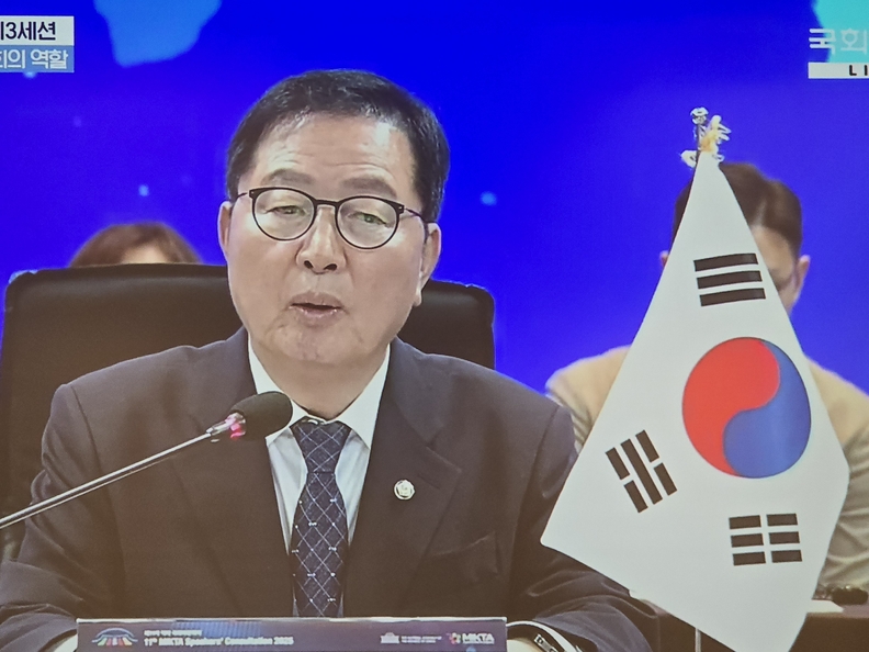 ▲우원식 국회의장이 12일 서울 광진구 그랜드&비스타 워커힐 호텔에서 열린 제11차 믹타(MIKTA)국회의장회의에서 개회사를 하고 있다(사진출처=한국탑뉴스)