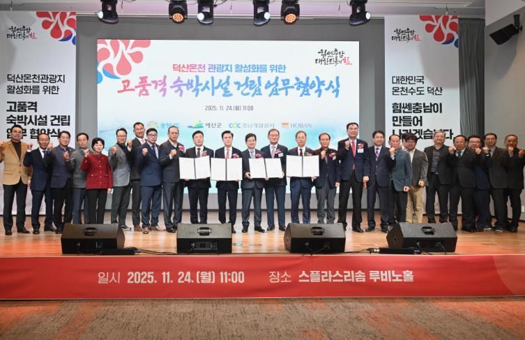 ㈜한국탑뉴스 차복원 기자 | 예산군은 24일 충청남도, 충남개발공사, ㈜호반호텔앤리조트와 함께 덕산온천관광지에 고품격 숙박시설 및 컨벤션 기능을 갖춘 복합 휴양시설 건립을 위한 업무협약(MOU)을 체결했다.
