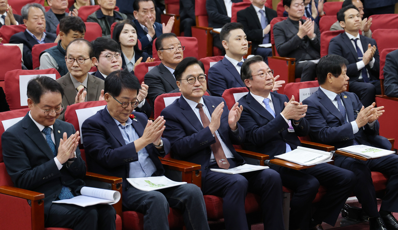 ▲국회의원회관에서 열린 '남북 유소년 축구 원산 대회 개최를 위한 정책 토론회'에 참석해 박수를 치고 있다.(사진출처=국회사무처)