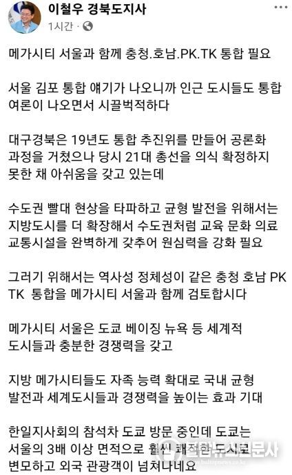 2020년 9월 대구경북행정통합 공론화위원회를 발족해 공정한 공론의 장을 통해 시도민의 다양한 의견을 수렴하며 행정통합을 논의해 왔으나, 최종적으로 확정되지 못하고 중장기적인 과제로 추진키로 한 바 있다.최근 서울 김포 편입 추진 방안이 대두되며 인근 도시들까지도 통합 여론이 불거져 나오는 가운데, 이철우 도지사는 메가시티 서울과 함께 충청, 호남, PK, TK도 통합이 필요하다는 입장을 3일 밝혔다.