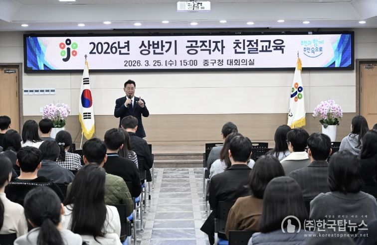 ㈜한국탑뉴스 송행임 기자 | 대전 중구는 25일 중구청 대회의실에서 공직자의 소통 능력 및 민원응대 역량 강화를 위해 직원 150여 명을 대상으로 ‘2026년 상반기 친절교육’을 실시했다고 밝혔다.