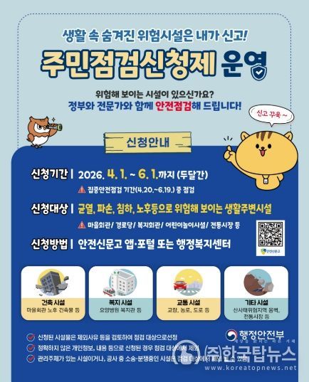특히 군은 주민이 직접 점검이 필요한 시설을 신청하는 ‘주민점검신청제’를 집중 운영한다. 신청 기간은 4월 1일부터 6월 1일까지이며, 마을회관이나 경로당 등 생활 밀착형 시설이 주요 대상이다. 안전신문고 앱 또는 읍·면 행정복지센터 방문을 통해 신청 가능하며, 공사 중이거나 소송·분쟁 중인 시설 등은 제외된다.