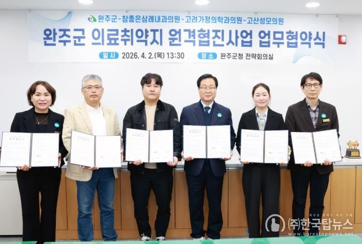 군은 2일 군청에서 참좋은삼례내과의원, 고려가정의학과의원, 고산성모의원 등 민간 의료기관 3개소와 ‘의료 취약지 원격 협진 시범 사업’ 추진을 위한 업무 협약을 체결했다.