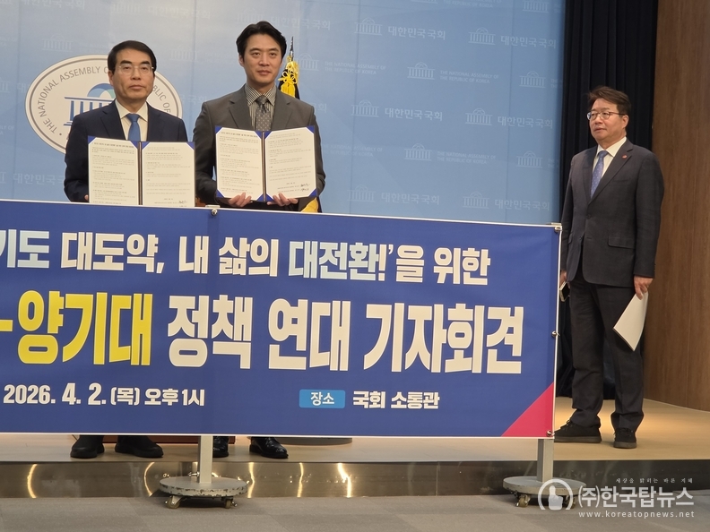 더불어민주당 경기도지사 경선에 나선 한준호 국회의원과 양기대 예비후보가 2일 국회 소통관에서 기자회견을 열고 '경기도 대도약과 도민 삶의 대전환'을 위한 전략적 정책 연대를 공식 선언했다.