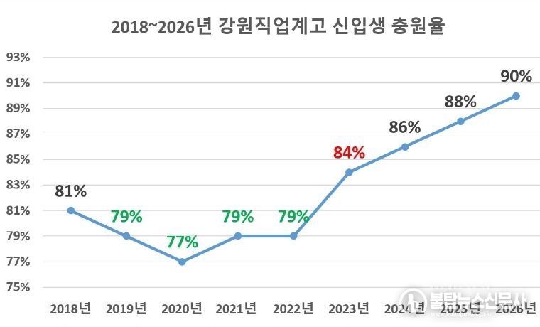 강도 높은 직업계고 재구조화를 통한 궁극적 목표는 단 하나, ‘신입생 충원율’이다. 직업교육 관련 모든 활동들(재구조화/교육과정/취업지원/입학홍보/환경개선 등)의 총체적 결과가 ‘학생들이 직업계고를 선택하는가?’로 귀결되기 때문이다. 이러한 측면에서 강원직업계고의 신입생 충원율 지표는 급반등하고 있다. 신입생 입학 연도별 충원율을 살펴보면 2018년 81% → 2019년 79% → 2020년 77% → 2021년 79% → 2022년 79%로 70%대에 머물던 충원율이 2023년 84%로 5년 만에 80% 저항선을 돌파했기 때문이다. 도교육청은 이에 만족하지 않고 더 과감한 지원과 혁신적 노력을 통해 2024년 86%, 2025년 88%, 2026년 90%를 목표로 교육감 임기 내 90% 이상 달성하는 로드맵을 제시하고 있다.