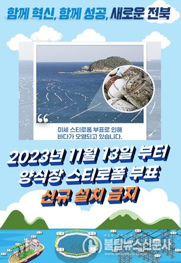 불탑뉴스 기자 | 전북도는 2021년 「어장관리법 시행규칙」 개정에 따라 지난해 11월 13일부터 김, 굴 등 수하식 양식장의 스티로폼(발포폴리스티렌) 부표 신규설치가 금지됐고, 올해 11월 13일부터는'수산업법'에 따른 정치망·마을어업·구획어업과'양식산업발전법'의 해조류, 패류, 어류, 복합 등 모든 양식장의 스티로폼 부표 신규설치가 금지된다고 밝혔다.