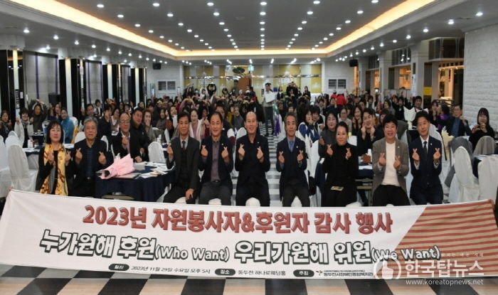 한국탑뉴스 송행임 기자 | 동두천시 장애인종합복지관은 지난 29일 동두천농협 하나로웨딩홀 3층에서 ‘2023년 자원봉사자&후원자 감사 행사’ [누가원해 후원(Who Want), 우리가원해 위원(We Want)]를 진행했다.