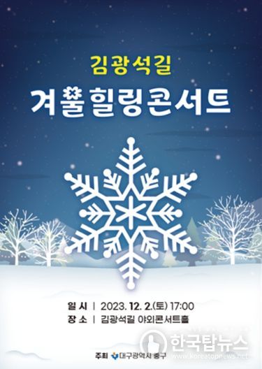한국탑뉴스 송행임 기자 | 대구 중구(구청장 류규하)는 오는 12월 2일 오후 5시 김광석길 야외콘서트홀에서 겨울철 따뜻한 감성을 채워줄 ‘김광석길 겨울 힐링콘서트’를 개최한다.