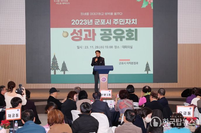 한국탑뉴스 송행임 기자 | 군포시는 지난 11월 29일 시청 대회의실에서 군포시 주민자치회 1년을 돌아보고 12개동 활동 성과를 공유하기 위해 2023년 주민자치회 성과공유회를 가졌다.