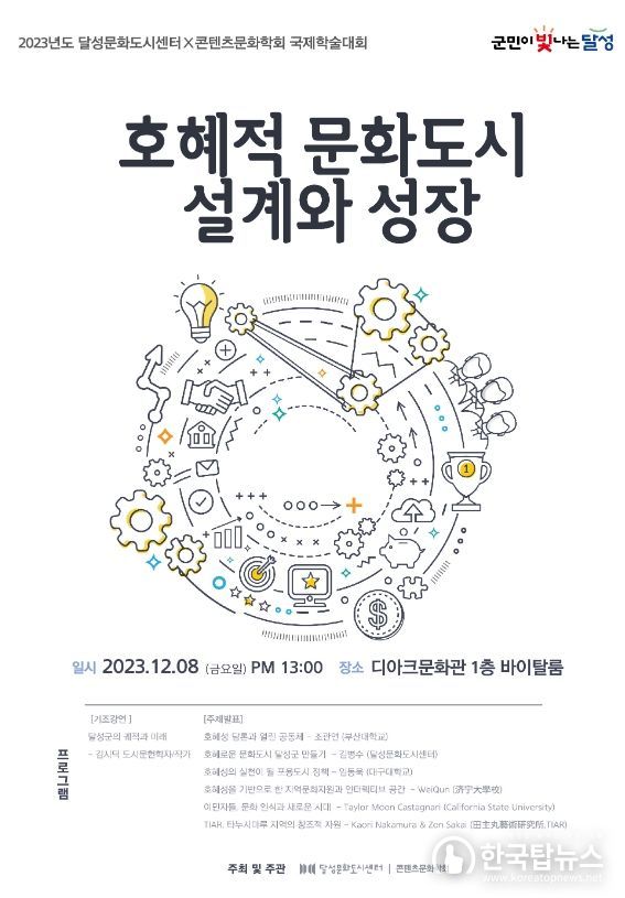 한국탑뉴스 송행임 기자 | ‘호혜적 문화도시 설계와 성장’이라는 주제로 2023년 12월 8일 금요일 오후 1시, 강정보 디아크 1층 바이탈룸에서 국제학술대회를 개최한다. 달성문화도시의 명확한 사업방향과 주체성을 확립하고 ‘호혜로운 관계’를 통한 콘텐츠 생성과 문화도시로서의 성장 가능성을 탐색하기 위해 콘텐츠문화학회와 협력하여 국제학술대회를 진행한다.