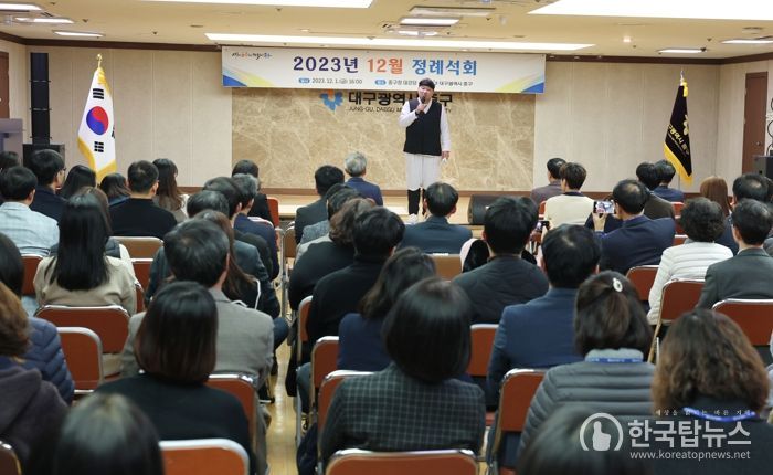 한국탑뉴스 송행임 기자 | 대구 중구는 1일 구청 대강당에서 전 직원을 대상으로 지역에서 대중적인 인기를 얻고 있는 방송인 ‘한기웅 강사’를 초청해 특강을 진행했다.