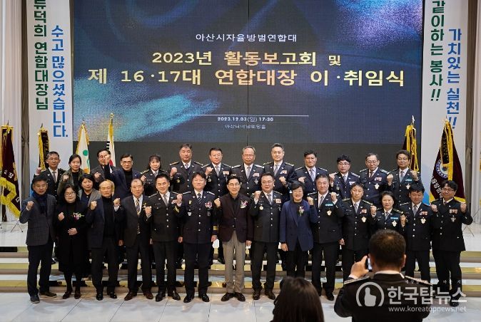 한국탑뉴스 송행임 기자 | 박경귀 아산시장은 지난 3일 아산터미널웨딩홀에서 열린 ‘아산시자율방범연합대 2023년 활동 보고 및 연합대장 이·취임식’에 참석해 방범대원들을 격려했다.