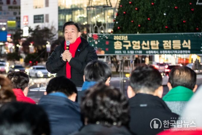 3일 저녁 열린 ‘2023 송구영신탑 점등식’에 참석한 이재준 수원특례시장은 “성탄 트리의 환한 불빛이 세상을 밝고 따뜻하게 만드는 희망의 불빛이 되길 바란다”며 “모든 이에게 따뜻한 세상이 되도록 수원시도 힘을 보태겠다”고 말했다.