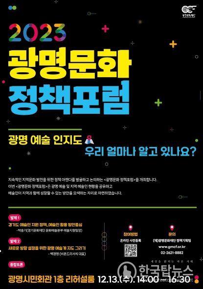 한국탑뉴스 송행임 기자 | (재)광명문화재단은 '광명 예술 인지도: 우리 얼마나 알고 있나요?'라는 주제로 2023년 광명문화 정책포럼을 12월 13일 오후 2시 광명시민회관 리허설룸에서 개최한다.