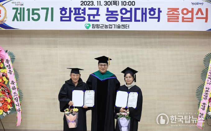 한국탑뉴스 송행임 기자 | 전남 함평군이 지난 30일 농업기술센터 플라워푸드교육장 다목적홀에서 졸업생과 가족 등 100여 명이 참석한 가운데 제15기 함평군농업대학 졸업식을 개최했다.