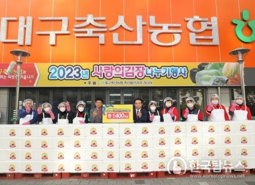 한국탑뉴스 송행임 기자 | 대구축산농협에서는 12월 4일 대구 북구 축산물프라자 침산점에서 취약계층의 따뜻한 겨울나기 지원을 위한 ‘2023년 사랑의 김장 나눔’행사를 갖고, 지역 소외계층에 전달해 달라며 김장김치 140박스(630만원 상당)를 대구 북구청에 기탁했다.