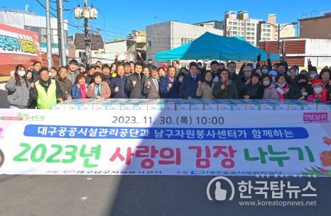한국탑뉴스 송행임 기자 | 대구광역시 남구자원봉사센터에서는 지난 30일, 온마을아이맘센터 주차장에서 2023년 사랑의 김장나누기 행사를 개최했다.