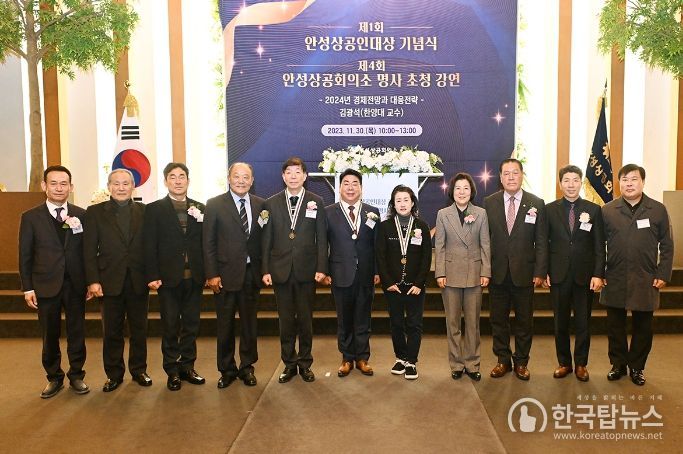 한국탑뉴스 송행임 기자 | 안성상공회의소는 11월 30일 안성 THE AW 웨딩컨벤션에서 ‘제1회 안성상공인대상 기념식’ 및 ‘제4회 안성상공회의소 명사초청 강연회’를 김보라 안성시장, 안정열 안성시의회 의장, 배영환 안성소방서장, 정순범 평택세무서장, 최장선 평택고용노동지청장 등 각 기관장과 안성상공회의소 의원 및 기업체 대표, 임직원 160여명이 참석한 가운데 개최했다.