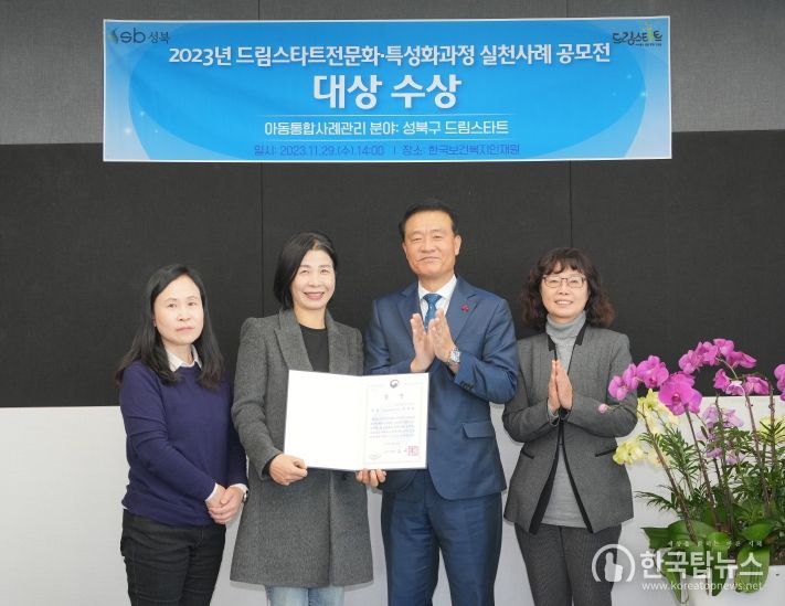 한국탑뉴스 송행임 기자 | 서울 성북구 드림스타트가 지난 11월 29일 한국보건복지인재원이 주최한 2023년 드림스타트 전문화·특성화 과정 현장 적용 실천사례 공모전에서 대상을 수상했다.